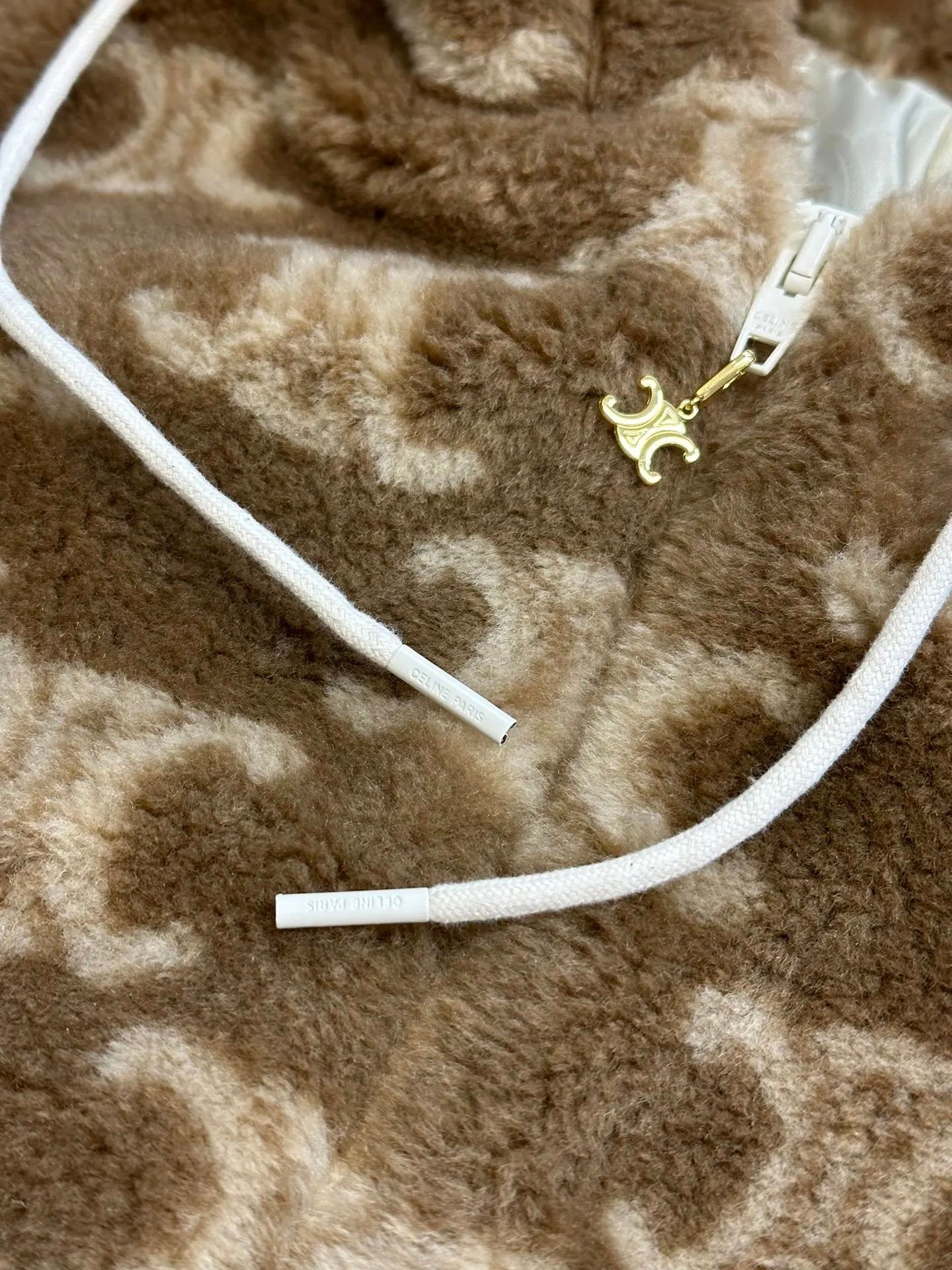 75% virgin wool, 25% polyester fiber, oversized hood with adjustable drawstring and engraved CELINE PARIS metal hoop.1 slit kangaroo-style pocket with zipper closure and TRIOMPHE tassel decoration.