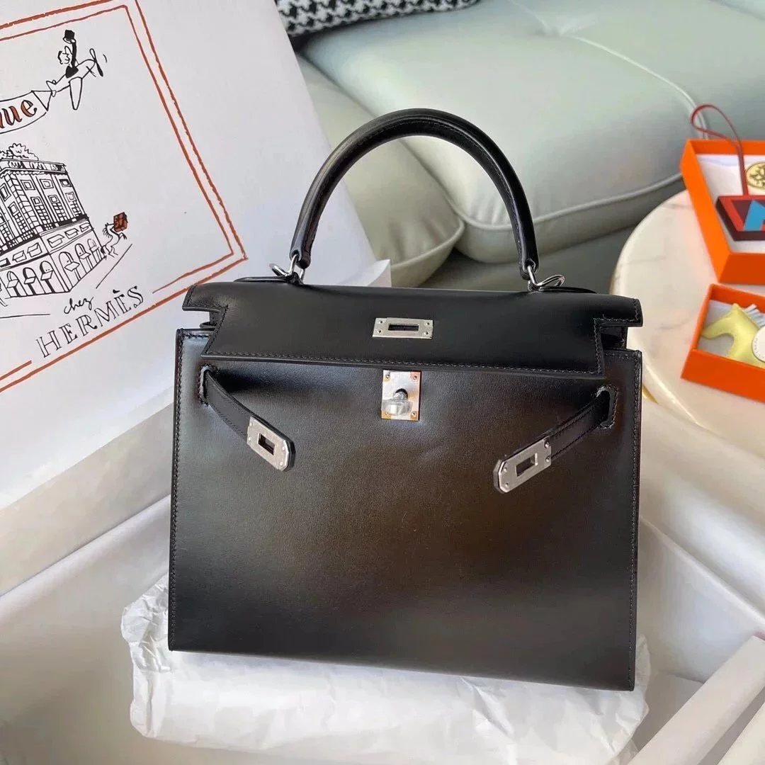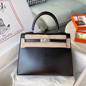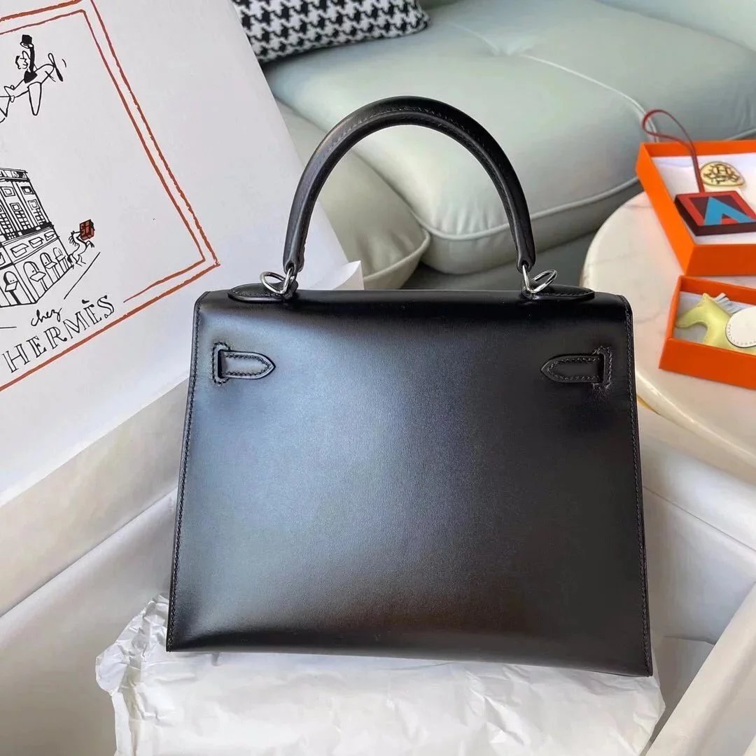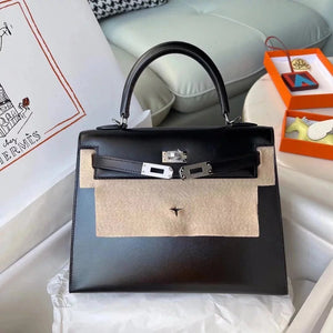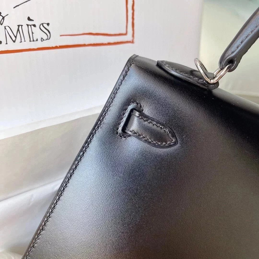 Hermes women's bag Top version Kelly bag28Women's Bag Kelly Genuine leather box Leather Wax Line Sewing Portable One-Shoulder Crossboby Bag Silver Buckle