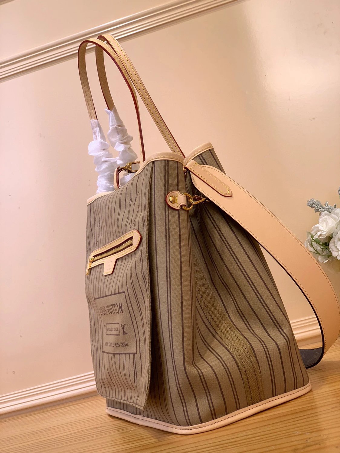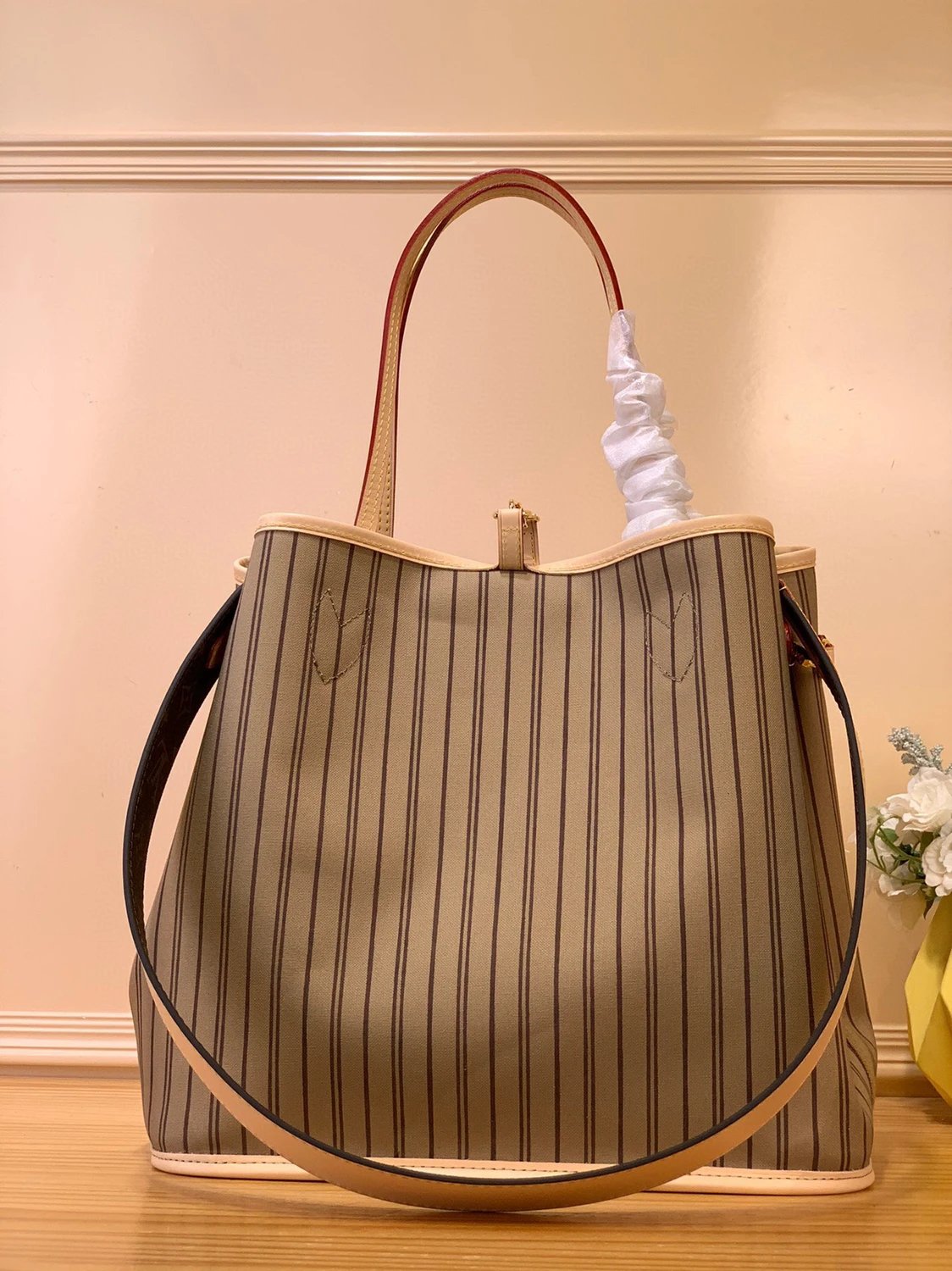 As One of the Classic Designs, Neverfull Bandoulière inside out Medium Handbag Is Made of Monogram Canvas and Striped Fabric This Time, Highlighting the Trend and New Ideas with Double-Sided Design. The Detachable Shoulder Strap Is Convenient to Cross Body and Can Also Be Used as a Hobo Handbag through the Side Hooks.
