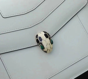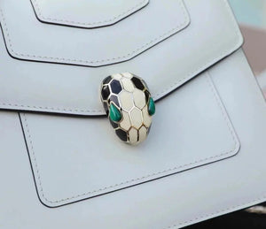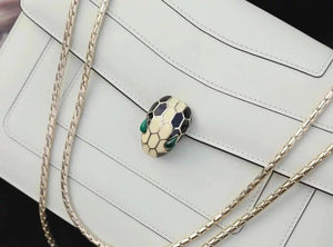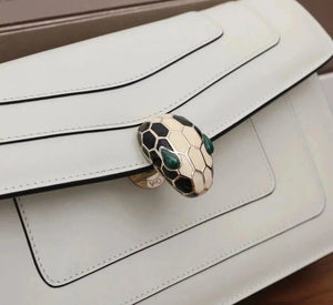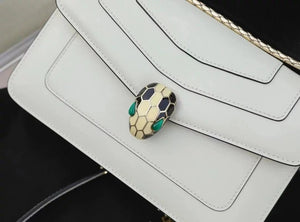\"Serpenti Forever\\" Series Crossbody Bag Stylish and Changeable This Bag Is Made of Pearl White Calfskin, with Light Gold-Plated Brass Accessories, Black and White Agate Color Enamel and Green Malachite Sensual Eyes, it Is Easy to Match Fashionable Daily Wear Dark Cell Compartment Pockets and Mini Makeup Mirror on One Side, and the Shoulder Strap Can Grow and Cross the Shoulder!