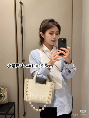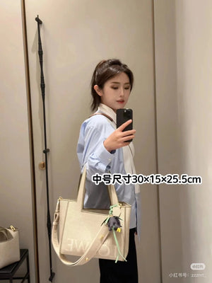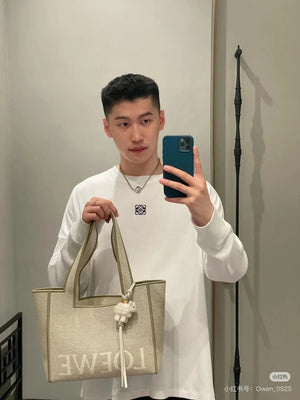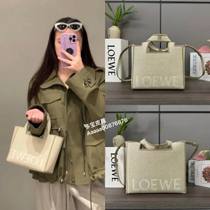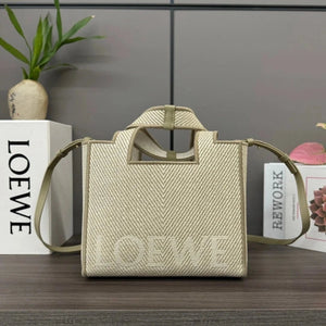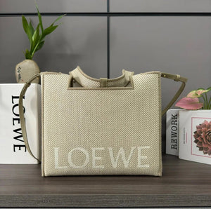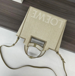 LO℮w℮? the New Jacquard Canvas Font Tote Handbag Is a Cuboid Handbag * Decorated with Contrast Color L's Hand W's Logo. The Large Version Is Made of Jacquard Canvas and Decorated with Leather Trim * Removable Adjustable Shoulder Strap Fabric Lining for Shoulder, Crossbody Or Hand.
