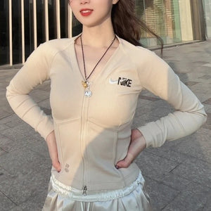 Nike Women's Tight V Collar Fishbone Rib Full Length Zip Placket Long Sleeve Top FD4797-126